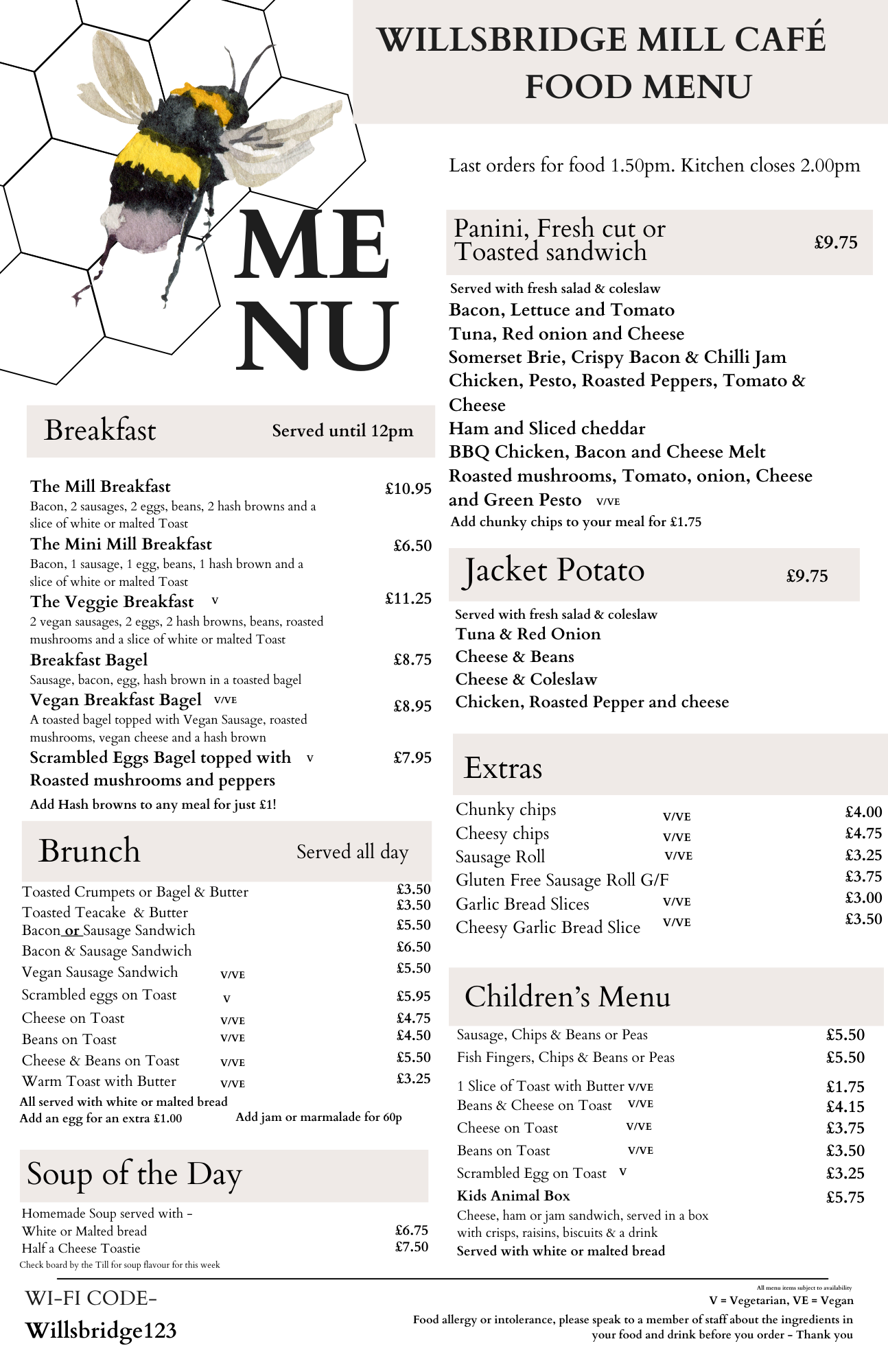 (kitchen closes at 14.00 daily- last orders 13.50).